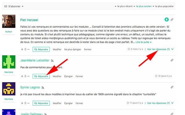 Vous avez la possibilité de laisser des commentaires en bas de chaque module. Un lien permet de ne faire afficher les réponses imbriquées que si cela vous intéresse.