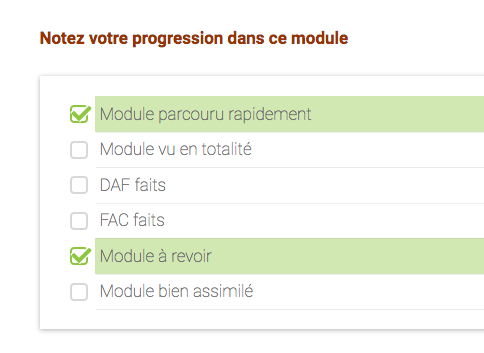 Vous pouvez maintenant accéder à une page pour noter votre avancement dans le cours Graphite. Ceci s’ajoute aux cases à cocher de chaque module.