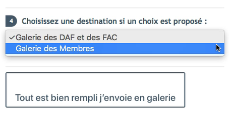 Vous pouvez mettre un dessin en Galerie des Membres depuis n’importe quel module en modifiant la Galerie de destination en bas du formulaire d’envoi, comme le montre cette image
